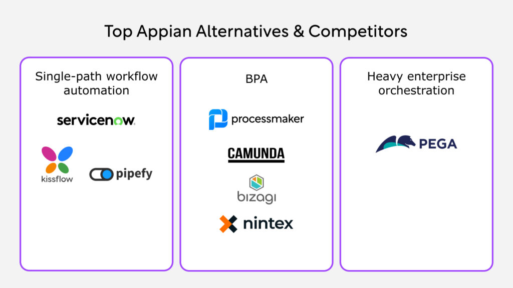 When exploring alternatives to Appian, it’s clear that the business process automation market offers a wide range of platforms tailored to different organizational needs. From robust solutions like ProcessMaker, Pega, and Camunda, which cater to complex automation and advanced orchestration, to simpler platforms like Pipefy and Kissflow, there’s a solution for every use case.