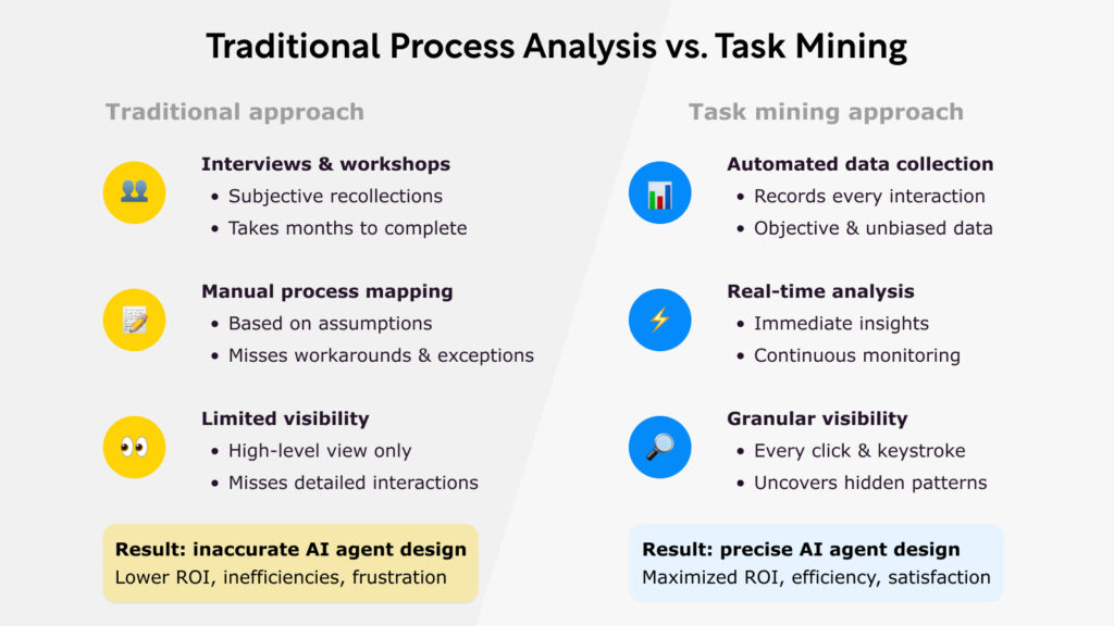 This is where task mining becomes indispensable. The adoption of agent technology (e.g., AI agents) to perform tasks in an automated way requires insights that are far more accurate than what traditional methods can provide. Task mining delivers the precise, detailed design requirements for these agents, ensuring they are built to perform tasks exactly as they should, without missing critical steps or nuances.